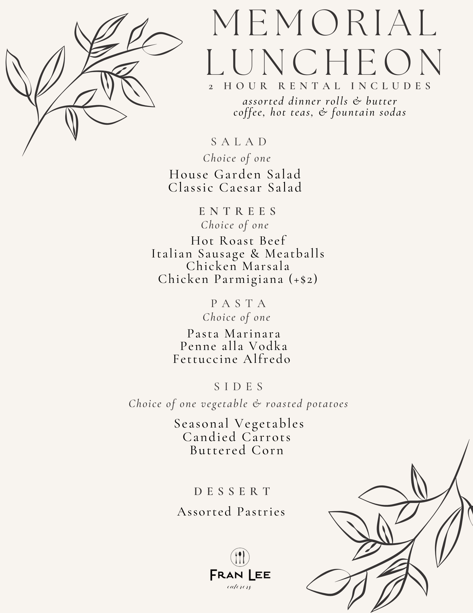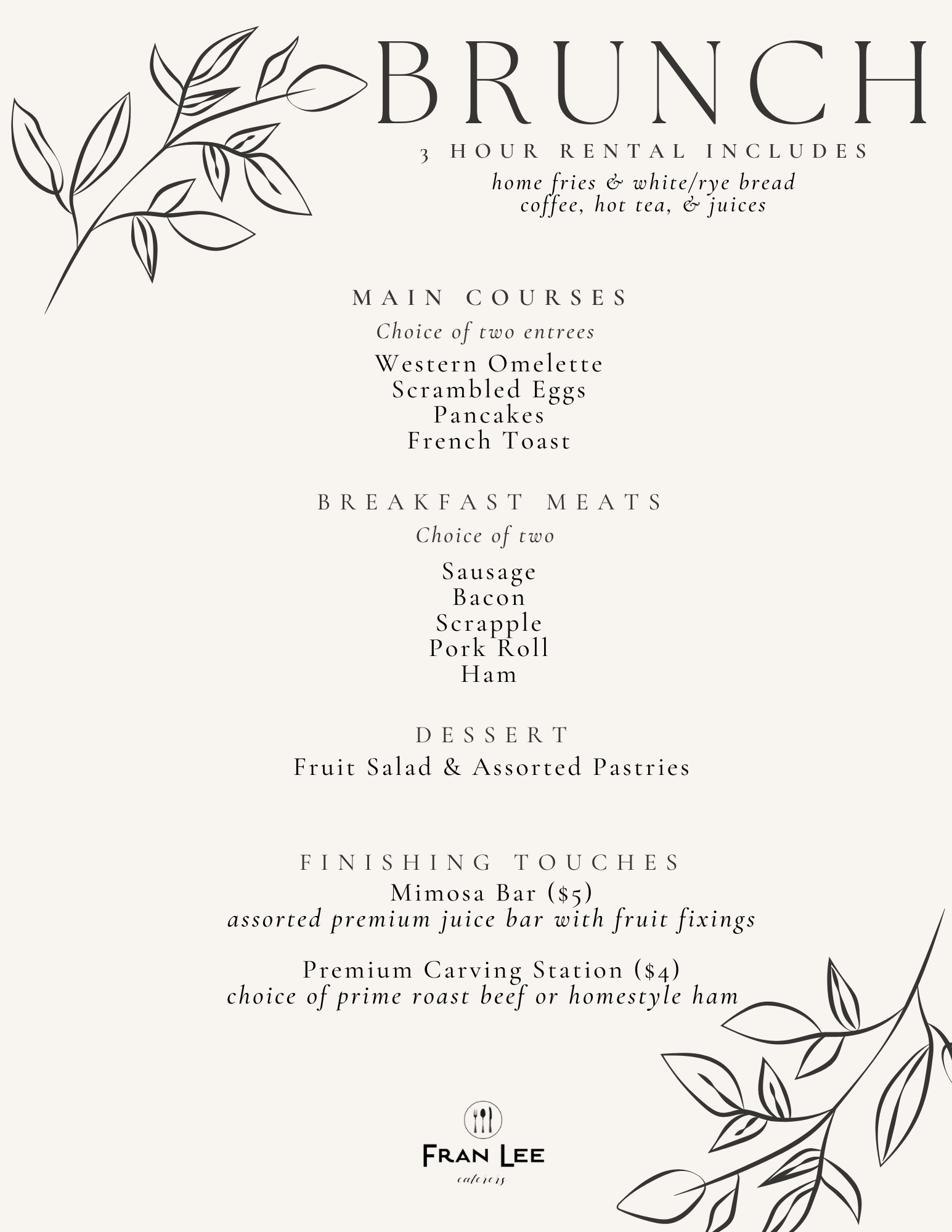 Please note that menu consultation is included in all event packages at Fran Lee Caterers.